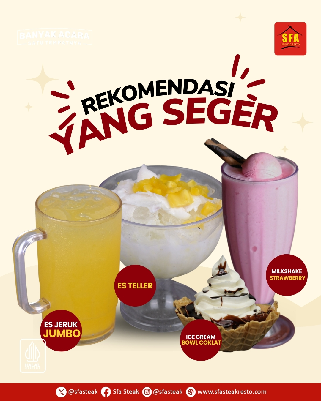 Mampir ke SFA Steak & Resto, udah nggak bingung mau pesan apa karena ada menu-menu best seler ini. Mau western vibes atau tetap cinta cita rasa nusantara? Di SFA Steak & Resto, semuanya ada!